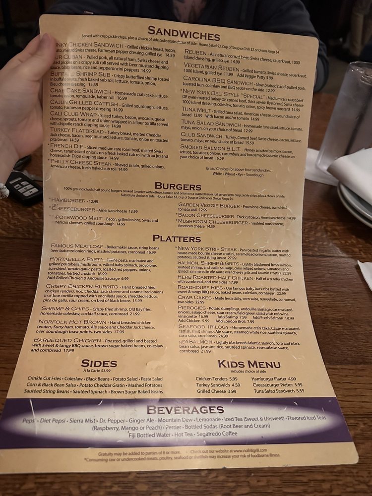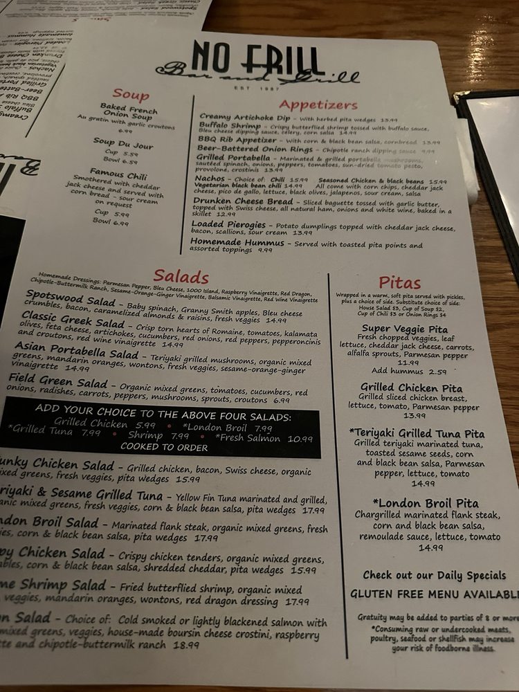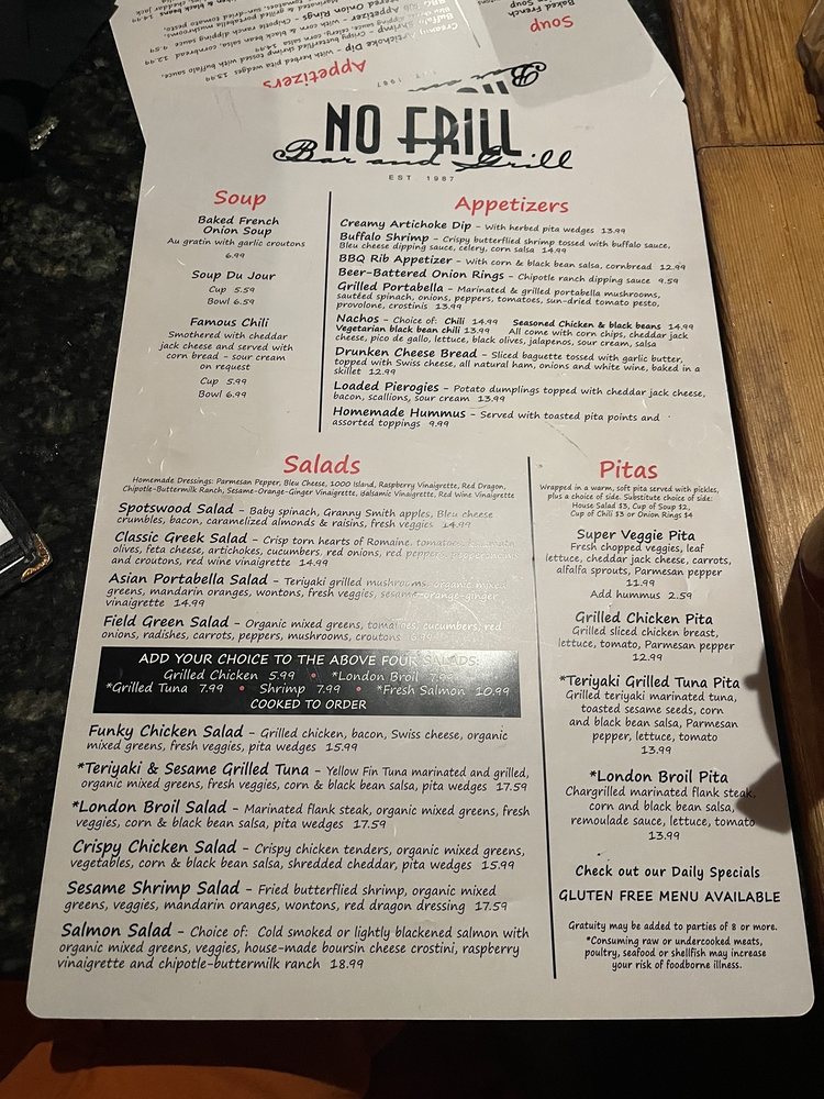 No Frill Bar and Grill, located in Norfolk, VA, is a casual dining spot offering American cuisine with a focus on sandwiches and salads. The menu includes a variety of starters like Artichoke Dip and Beer Battered Onion Rings, as well as hearty salads such as the Asian Portobello Salad and Crispy Chicken Salad. The Pitas section features options like the Chicken Pita and London Broil Pita. Customers rave about the loaded pierogies, Buffalo shrimp sub, and meatloaf, all served with exceptional service. The warm and cozy atmosphere, along with prompt service, make No Frill Bar and Grill a perfect choice for a quick and reasonably priced meal. Make sure to try their signature dishes and enjoy a delightful dining experience.
